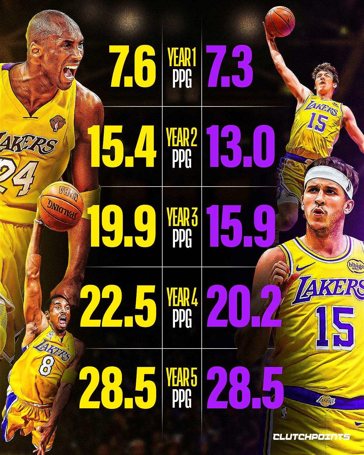 虎撲12月02日訊 今日,美媒ClutchPoints曬出了奧斯汀-里夫斯與科比-布萊恩特相似的媒對(duì)前五年數(shù)據(jù)對(duì)比并配文:
