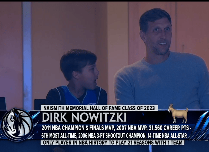 比賽的維茨第二節(jié),諾維茨基在現(xiàn)場包廂觀賽,基觀介紹達(dá)拉斯轉(zhuǎn)播畫面介紹帶有“Goat”圖案。賽達(dá)