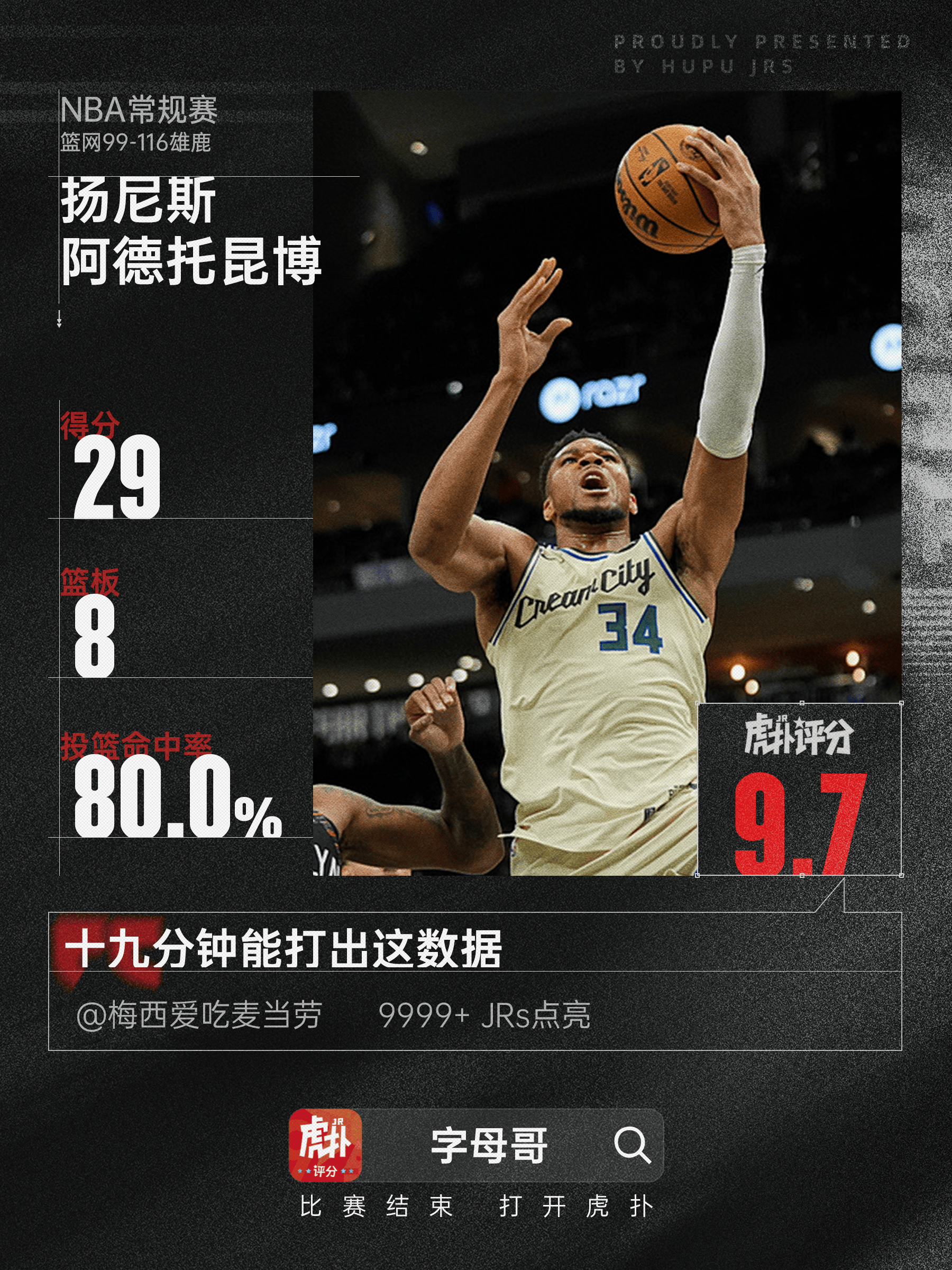 本場比賽,雄鹿球員揚尼斯-阿德托昆博出戰(zhàn)18分鐘,15投12中,其中三分球2投1中,罰球8投4中,得到29分8籃板2助攻2搶斷。