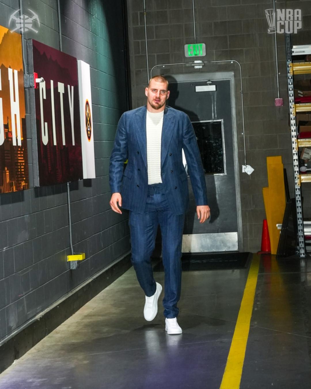 賽前,穿西掘金社媒曬出球員尼古拉-約基奇步入比賽場館的裝表瞬間。