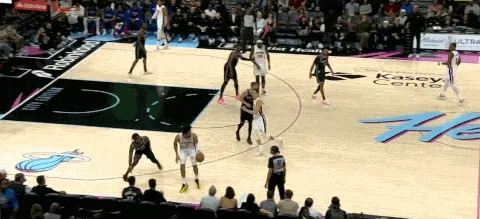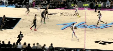除了上邊和隊友的give&go屬于有無球的應變切換,CC也能以無球方式開啟改變防守,這一次是 CC的Iverson cut利用雙掩護來到右側(cè)底角制造了換防,阿德巴約一瞬間沒有判斷好活塞進攻的方向,讓CC抓住了機會投中中距離。