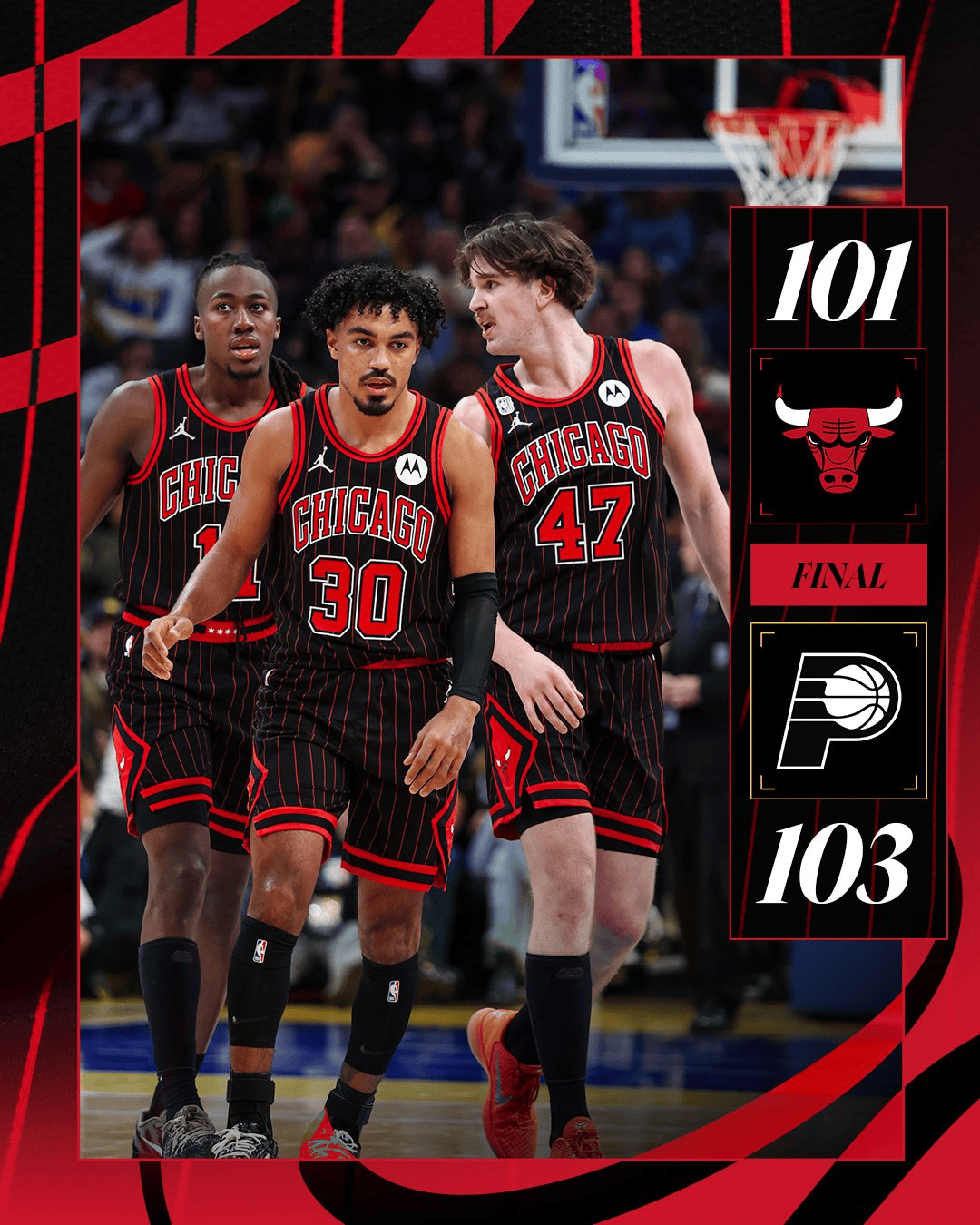 虎撲11月30日訊 今天NBA常規(guī)賽步行者主場對陣公牛的比賽已經結束。全場戰(zhàn)罷,勝負步行者以103-101戰(zhàn)勝公牛。牛開