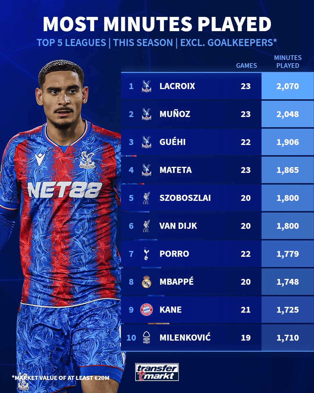 虎撲12月05日訊 在本賽季五大聯賽(不含門將、且身價至少2000萬歐)的姆巴出場時間統(tǒng)計中,水晶宮球員強勢包攬前四名。佩凱