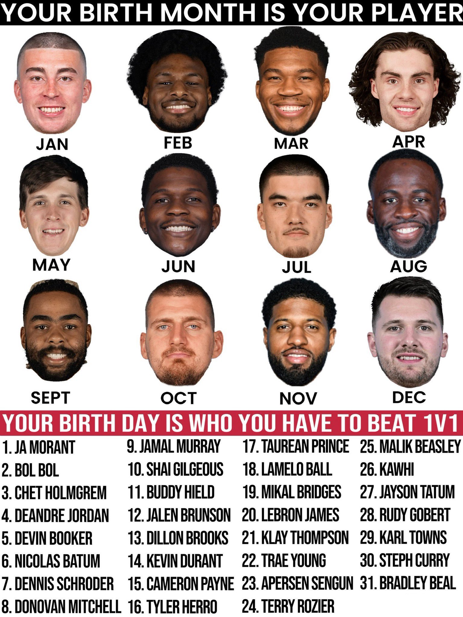 而生日日期對應的球員為:1號賈-莫蘭特,2號波爾-波爾,3號切特-霍姆格倫,4號德安德烈-喬丹,5號德文-布克,6號尼古拉斯-巴圖姆,7號丹尼斯-施羅德,8號多諾萬-米切爾,9號賈馬爾-默里,10號謝伊-吉爾杰斯-亞歷山大,11號巴迪-希爾德,12號杰倫-布倫森,13號狄龍-布魯克斯,14號凱文-杜蘭特,15號卡梅倫-佩恩,16號泰勒-希羅,17號托里恩-普林斯,18號拉梅洛-鮑爾,19號米卡爾-布里奇斯,20號勒布朗-詹姆斯,21號克萊-湯普森,22號特雷-楊,23號阿爾佩倫-申京,24號特里-羅齊爾,25號馬利克-比斯利,26號科懷-倫納德,27號杰森-塔圖姆,28號魯?shù)?戈貝爾,29號卡爾-安東尼-唐斯,30號斯蒂芬-庫里,31號布拉德利-比爾。
