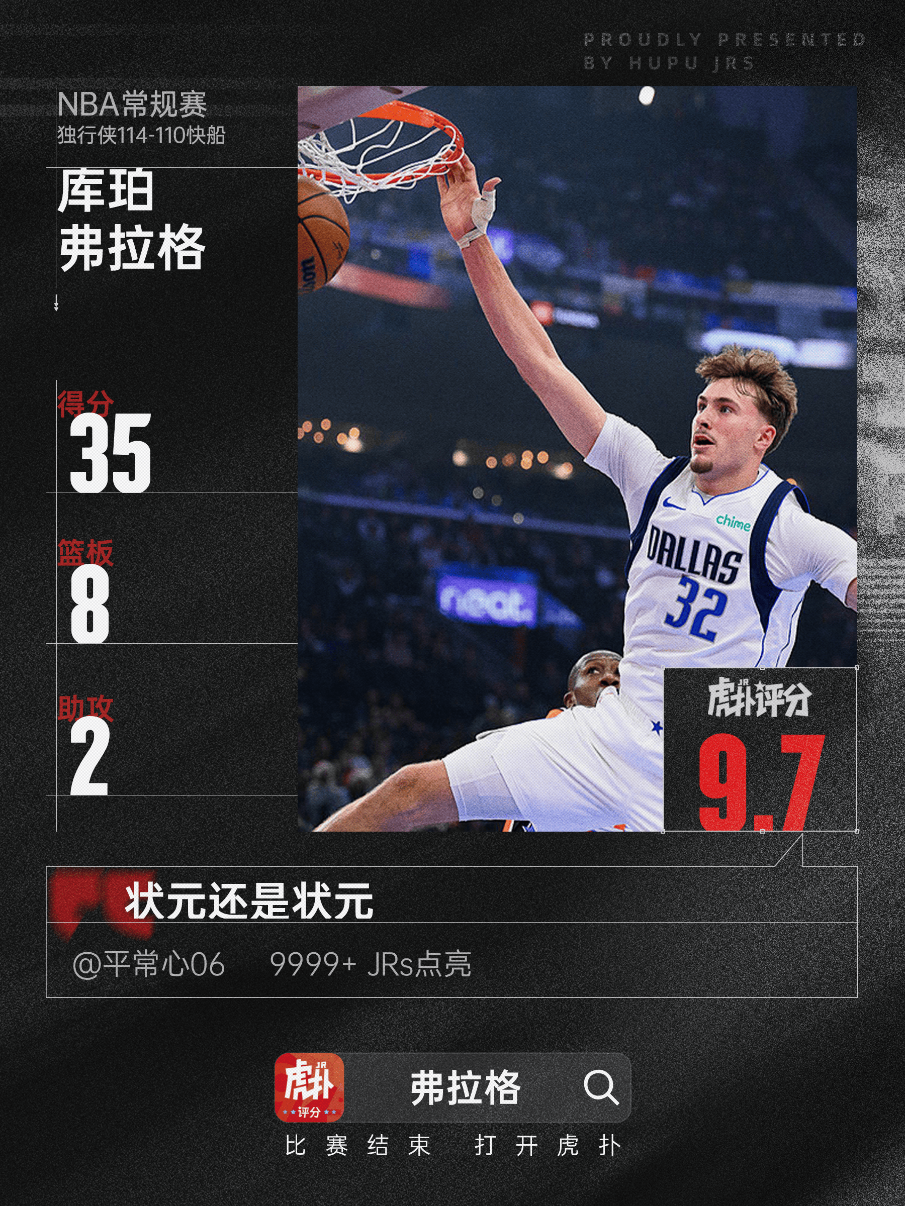 本場比賽,場砍獨(dú)行俠球員庫珀-弗拉格出戰(zhàn)37分鐘,下分22投13中,籃板其中三分球3投0中,生涯罰球11投9中,夜助攻得到35分8籃板2助攻。弗拉