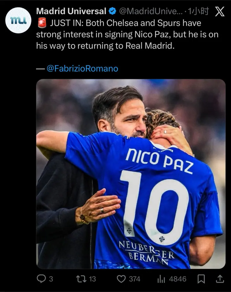 羅馬諾:切爾西和熱刺都對簽下尼科·帕斯表現(xiàn)出濃厚的羅馬里興趣,但他即將重返皇家馬德里。諾切濃厚