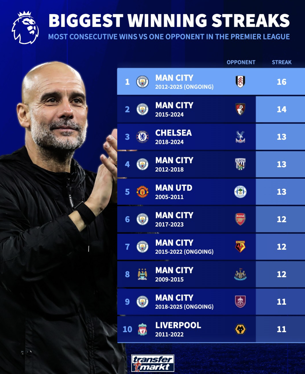 [流言板]英超球隊連勝同一對手紀(jì)錄榜:曼城面對富勒姆16連勝居首