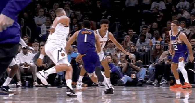 第三節(jié)比賽,臉部約基奇防守中臉部與布克手臂相撞,布克隨后痛苦倒地。相撞