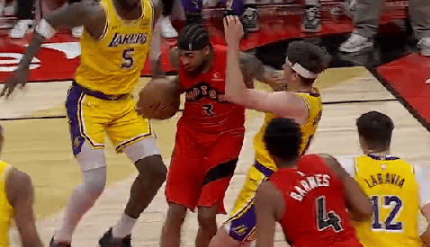 NBA常規(guī)賽,猛龍主場(chǎng)迎戰(zhàn)湖人的拉姆里比賽正在進(jìn)行中。