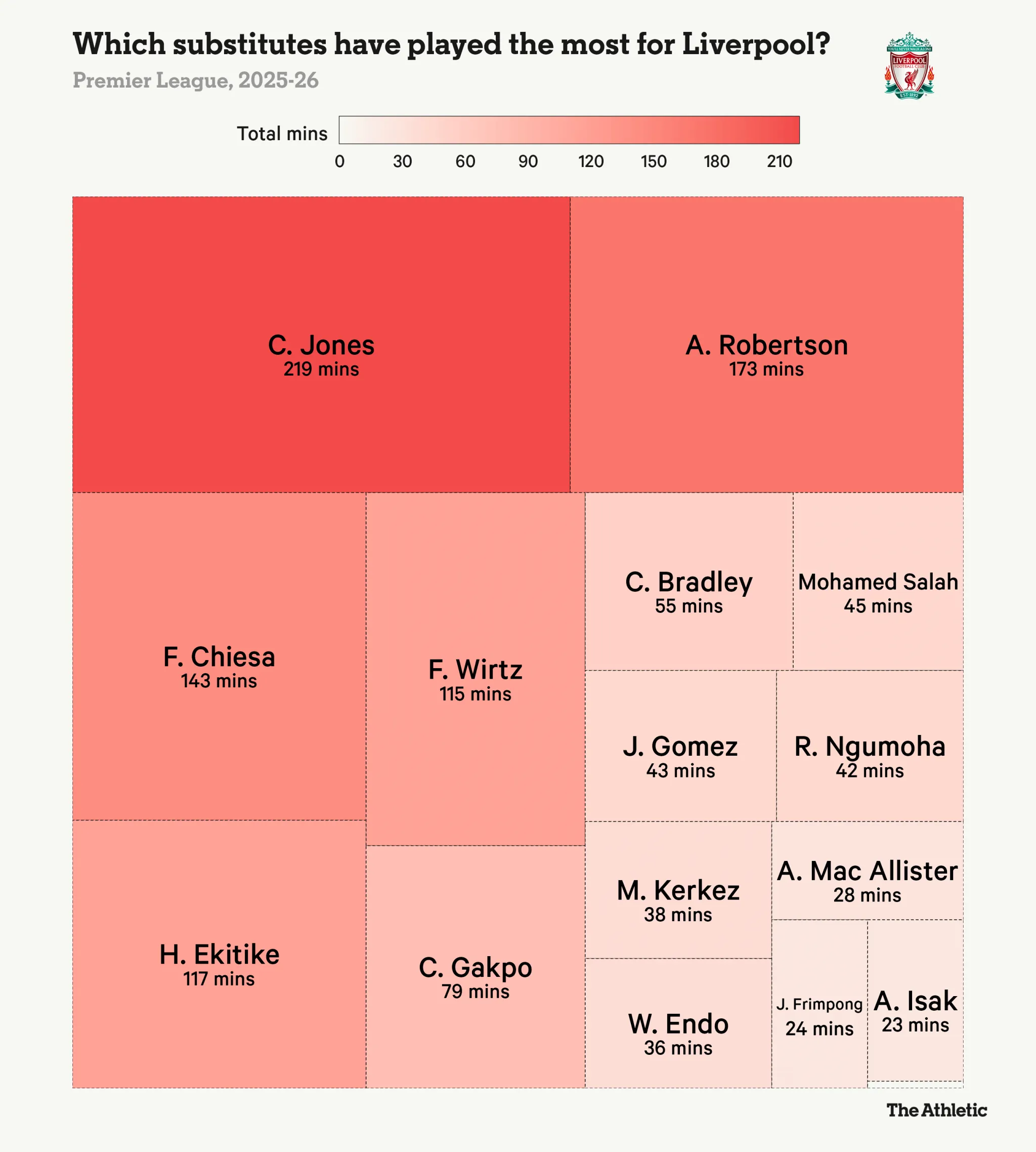 虎撲12月05日訊 The Athletic UK本周的數(shù)據(jù)分析專欄,聚焦于英超20隊(duì)的替補(bǔ)問題。