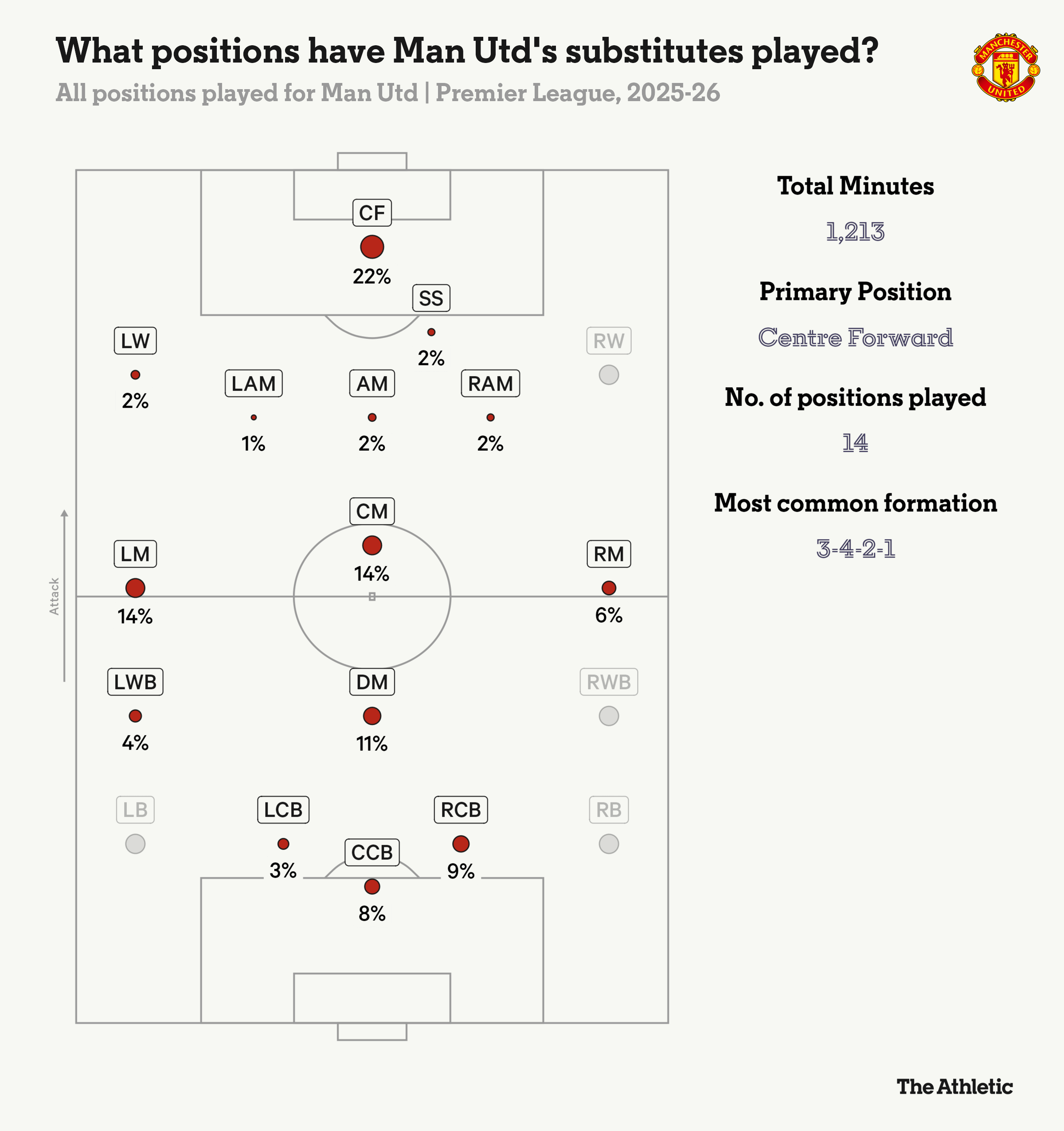 阿莫林確實(shí)比其他任何位置都更頻繁地?fù)Q上中鋒,前鋒占據(jù)了所有替補(bǔ)出場時間的24%。但他在這個位置上的兩個選擇——齊爾克澤和今夏以6640萬英鎊加盟的受傷球員本杰明-舍什科——都狀態(tài)不佳或傷情欠佳。