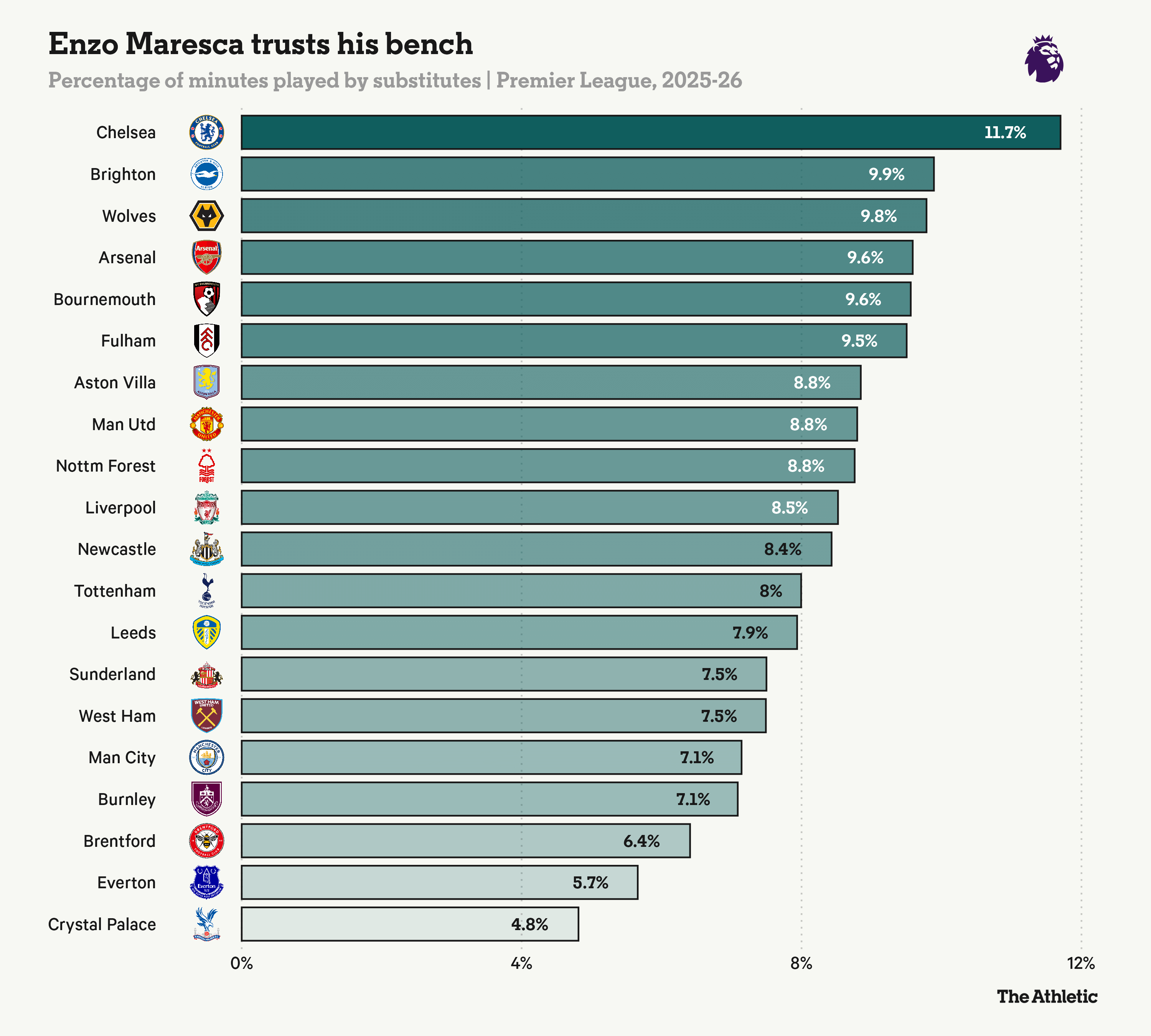 虎撲12月05日訊 The Athletic UK本周的數(shù)據(jù)分析專欄,聚焦于英超20隊(duì)的爾西替補(bǔ)問題。